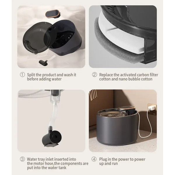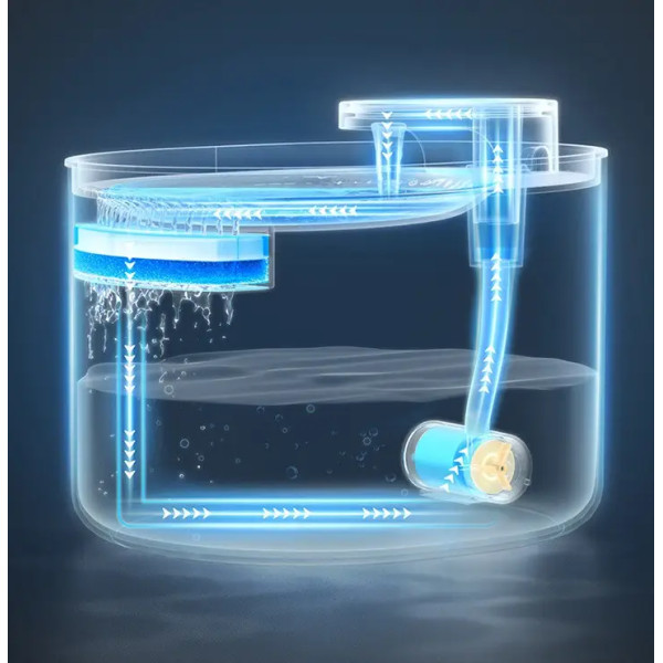 Во включенном состоянии и при достаточном количестве воды в поилке постоянно циркулирует жидкость. При этом она оснащена трехступенчатой системой фильтрации , что позволяет сохранить воду свежей и чистой.
