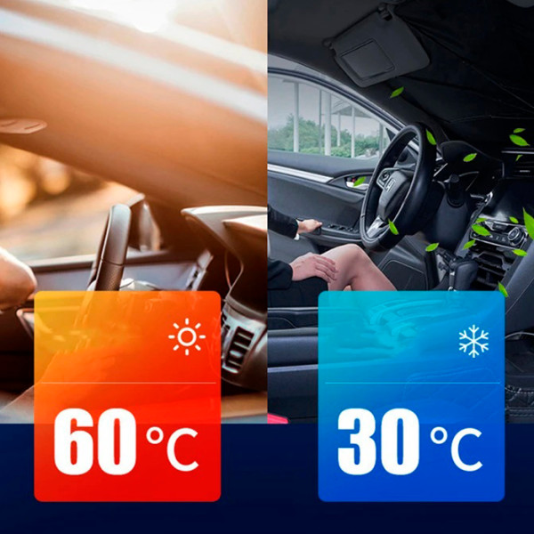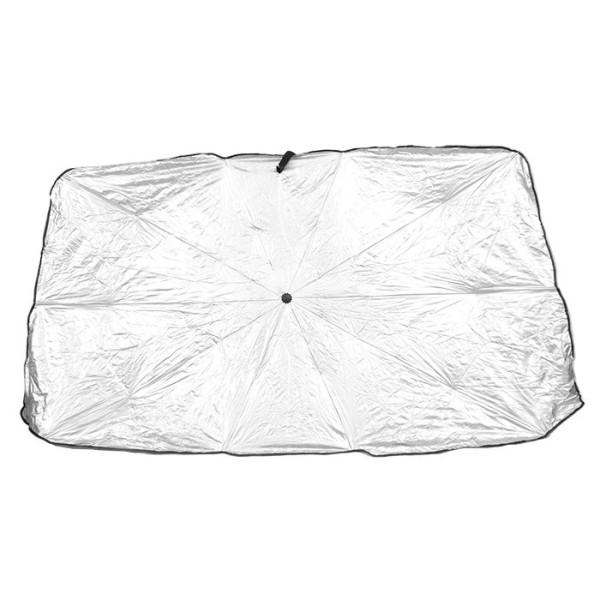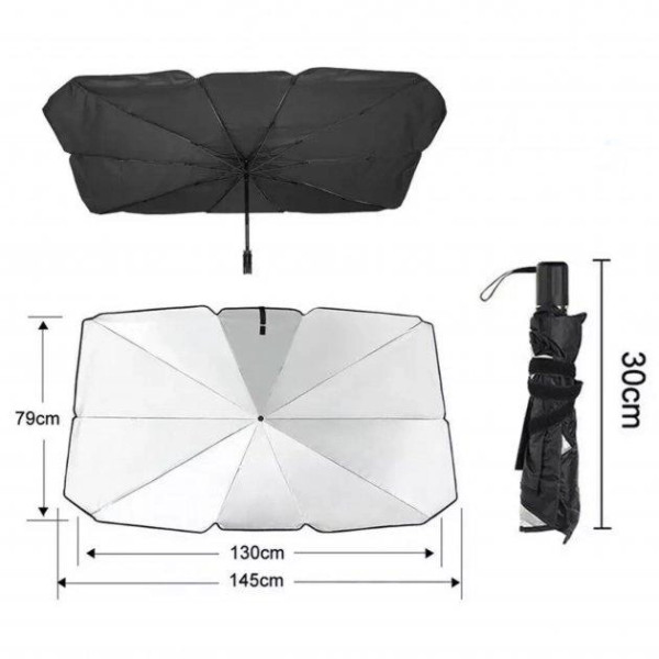 Автомобильная шторка выполнена в виде обычного зонта с ручкой. В раскрытом состоянии зонтик-шторка ложится на торпеду и прижимается штатными солнцезащитными козырьками. Внутренняя часть зонта черная, наружная часть серебристого цвета, что способствует отражению солнечных лучей и понижению температуры в салоне автомобиля. Размер зонтика в разложенном состоянии 133х76 см. Зонтик-шторка в сложенном состоянии не занимает мало места и помещается в карман двери или бардачок автомобиля.