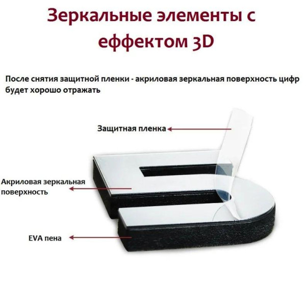 - Материал цифр: зеркальный акрил, толщиной 2 мм + прослойка пенопласта 1см (создает эффект 3Д на стене)
