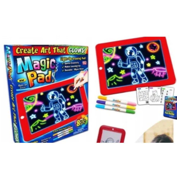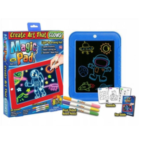 Magic Pad -  световой планшет поможет нарисовать рисунок, который удивит своей необычностью. Новый взгляд на использование люминофора подарил детям и их родителям оригинальное средство для создания картинки. При помощи неоновых ручек создается удивительное изображение. Есть несколько трафаретов, которые помогут маленькому художнику сориентироваться, как обращаться с планшетом.