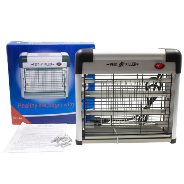 Устройство работает по принципу электрического ограждения, когда уничтожитель подключен к сети, его внутренняя решетка находится под напряжением, как только комар или другое насекомое касается решетки, через его тело пропускается электрический разряд, моментально уничтожающий вредителя. В качестве приманки Pest Killer PK-12A использует две лампы, что излучают свечение сине-фиолетовое свечение, которое эффективно привлекает большинство видов летающих насекомых.