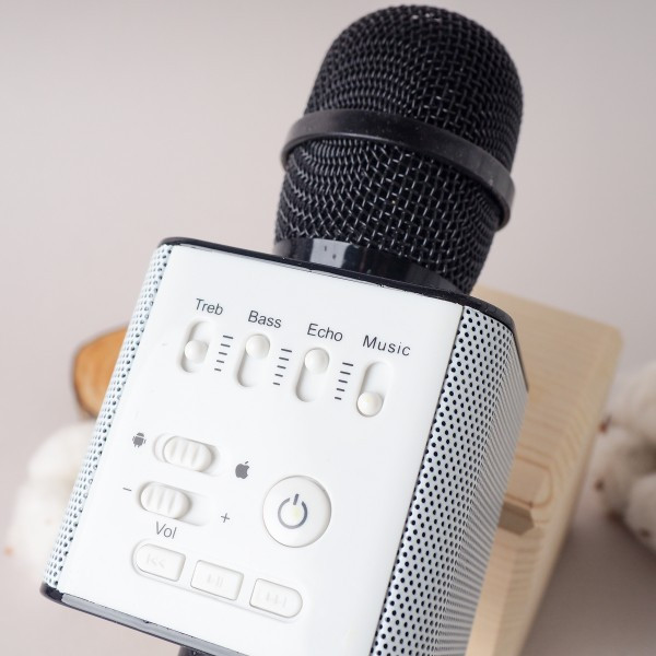 Беспроводной микрофон караоке MicGeek Q9 Bluetooth - это новинка и хит года. Причин популярности данного устройства в мире много - это необыкновенная универсальность, оригинальность, функциональность удобство и простота его использования. Микрофон с динамиком внешне представляет из себя стандартный вокальный микрофон с кубическим модулем встроенным в рукоять. В этот модуль встроены 2 стерео динамика, а так же, панель управления функциями и звуком. Кнопка включения и ползунковые регуляторы звука удобно расположены под большим пальцем. Благодаря им вы легко и быстро сможете настроить подходящий вам уровень громкости голоса (Volume), подрегулировать высокие частоты (Treble), нижние частоты (Bass), добавить эффект эхо (Echo), подобрать громкость воспроизводимой устройством музыки (Music).