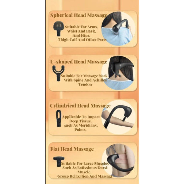 В комплекте 4-6 сменных насадок для точечного, расслабляющего или интенсивного массажа.