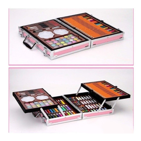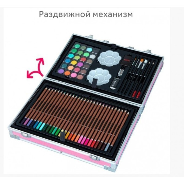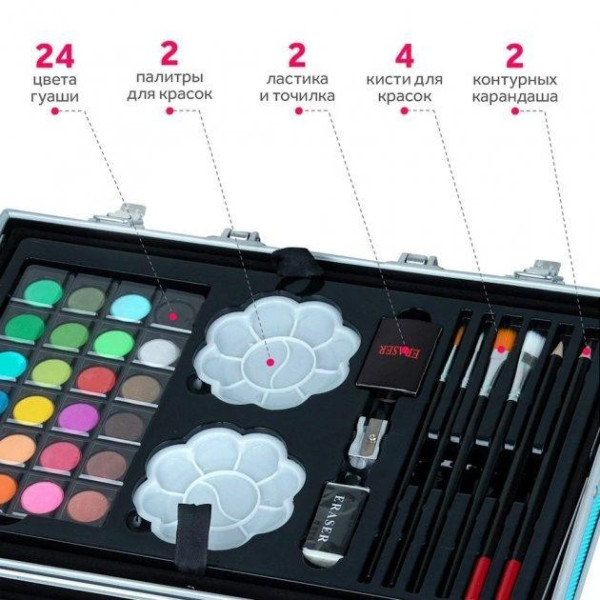 В нем есть 145 предметов на все случаи: несколько видов карандашей, фломастеры, краски, ребенок сможет попробовать все стили прорисовки, при этом вы не потратите лишние деньги. В комплекте Вы найдете все что нужно для «красочного творчества»: краски, карандаши, фломастеры и другие мелкие аксессуары.
