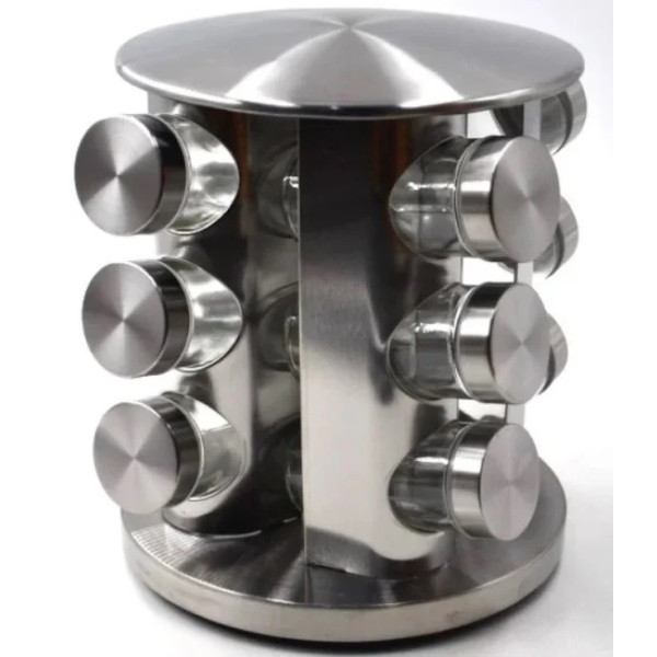 Подставка для специй изготовлена из нержавеющей стали и может вращаться по кругу, что очень удобно и практично. Емкости выполнены из стекла, а крышки к ним — из нержавеющей стали. Баночки плотно и надежно закрываются, благодаря чему ароматные приправы не потеряют свои свойства и запах.