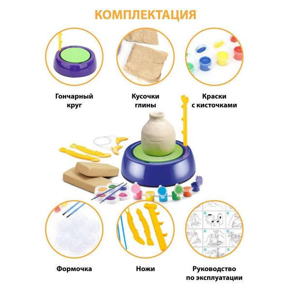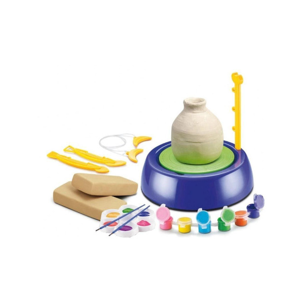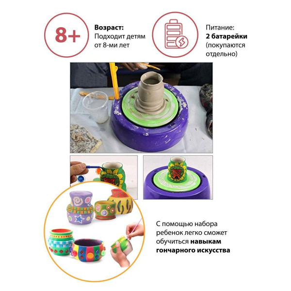 Прекрасный набор для развития творчества, в который входит гончарный круг и все необходимое для работы с ним. В комплекте присутствует настоящая глина, а также краски для раскрашивания создаваемых изделий. Это своего рода миниатюрная мастерская. Работа на гончарном круге не только порадует ребенка, но и окажет полезное воздействие на функционирование детских пальчиков, запястий. Набор дает широкое поле для фантазий и деятельного мышления. С его помощью ребенок сможет обучиться навыкам гончарного искусства.