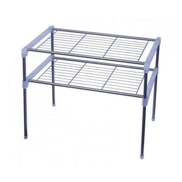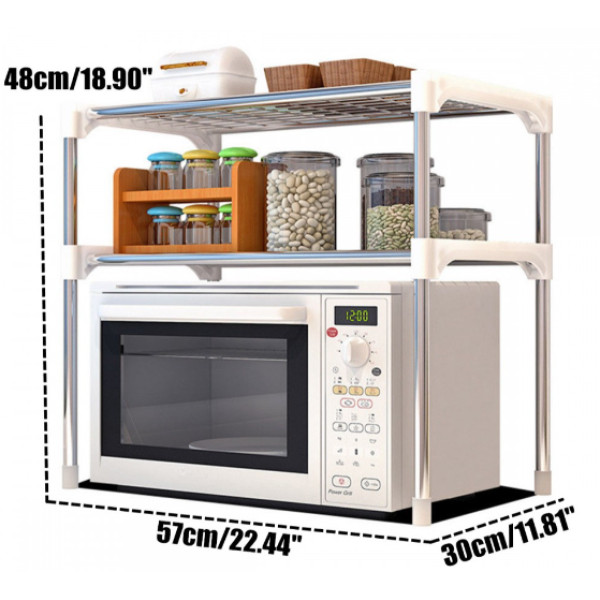 Прочный настольный стеллаж для микроволновки или другой бытовой техники. Каркас выполнен из металлических трубок, соединенных пластиковыми креплениями. Две широкие полки позволят организовать пространство и удобно разместить над СВЧ печью множество кухонных принадлежностей.