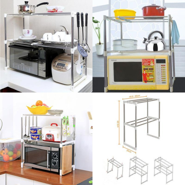 Раздвижные полки позволяют регулировать ширину стеллажа: от 50 до 85 см, поэтому конструкция подойдет даже для крупногабаритной микроволновки.