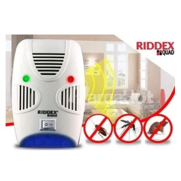 Riddex Quad – это новейшая разработка, помогающая эффективно выводить грызунов, тараканов и комаров. Прибор работает по принципу создания двойного действия против вредителей в виде ультразвука и электромагнитных импульсов. Таким образом, излучения расширяются в четырех направлениях по сетевой разводке и распространяются на площадь в 200 квадратных метров! Но самая отличительная черта устройства – его действие в тех отдаленных местах, где нет доступа для человека: под половицами или внутри стен.