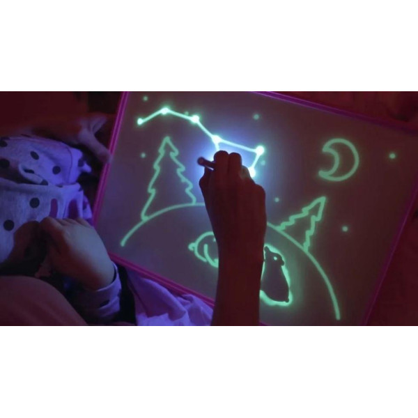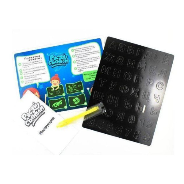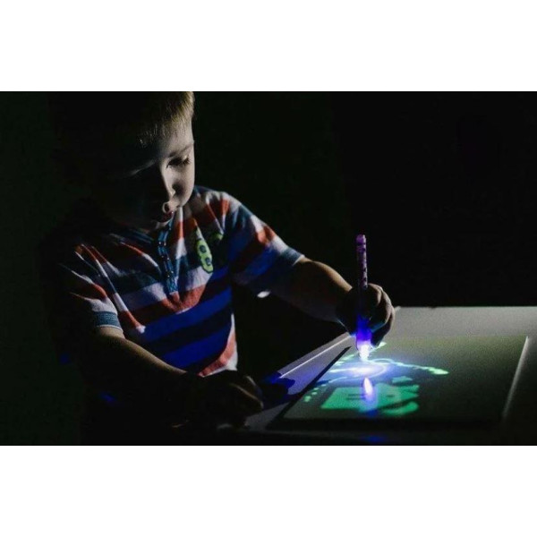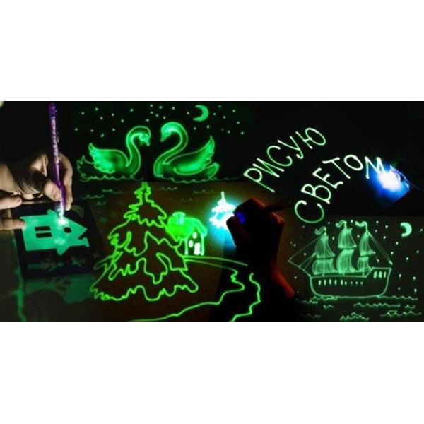 Планшет "Рисуй светом" представляет собой дощечку для рисования. Вы можете рисовать специальной ручкой-фонариком. Также ручка-фонарик имеет невидимые чернила, которые светятся в темноте при свечении ультрафиолетом. Ребенок может их использовать во время шпионских игр. Рисовать можно не только в темноте, но и днем. Основа набора это планшет Рисуй Светом c покрытием накапливающим свет и ручка-фонарик. Достаньте планшет из светонепроницаемого чехла, прикоснитесь маркером к планшету, одновременно удерживая нажатой кнопку на маркере, и начинайте рисовать.