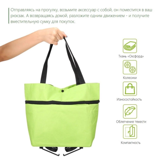 В сложенном виде компактная, оснащена удобной ручкой-петлей для переноски и подвешивания. Модель легко трансформируется – за несколько секунд разлагается в хозяйственную сумку на колесах.