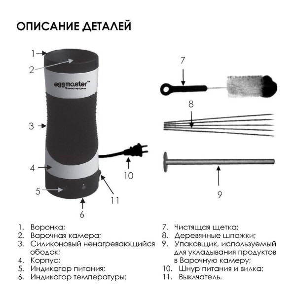- Эггмастер комплектуется деревянными шампурами и удобной щеточкой для чистки контейнера.