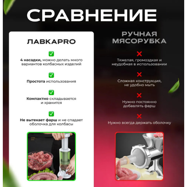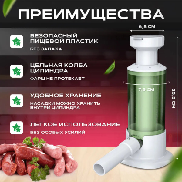 Совместимость с разными типами оболочек: Устройство легко адаптируется под разные виды натуральных и искусственных оболочек, что значительно расширяет возможности кулинарных экспериментов.