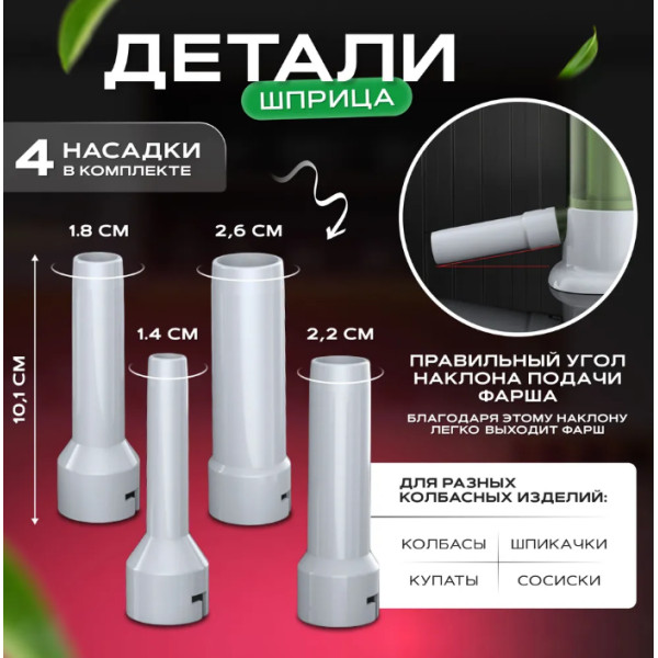 Сменные насадки: Шприц поставляется с набором различных насадок, что позволяет использовать его для различных видов оболочек. Это дает возможность готовить колбасы разного диаметра и формы, удовлетворяя любые вкусовые предпочтения.