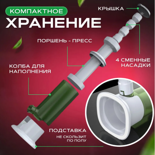 Компактные размеры: Благодаря вертикальной конструкции шприц занимает минимум места на кухне и не создает неудобств при хранении. Он легко помещается в шкафу или на кухонной полке, экономя пространство.