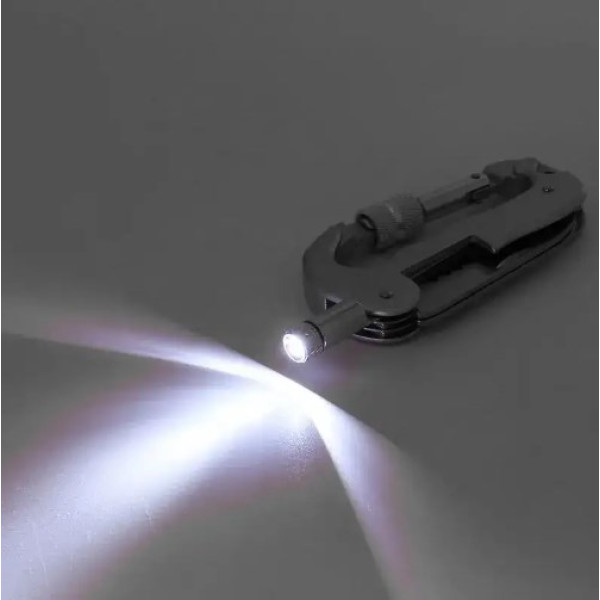 Изготовлен прибор из специальной нержавеющей стали, отличающегося легким весом и высокой прочностью. Данное приспособление сочетает в себе функции карабина, ножа и фонарика, поэтому независимо от разнообразия условий данный аксессуар будет уместен.