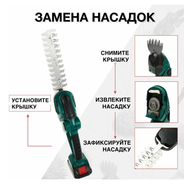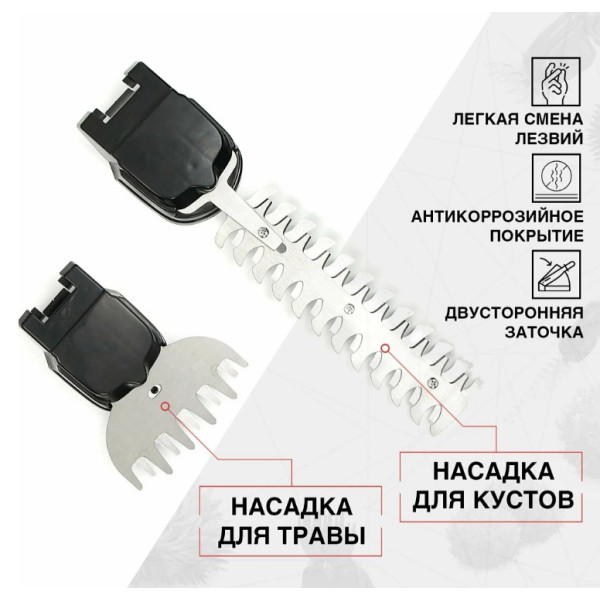Сменные насадки – универсальность для стрижки как травы, так и кустов.