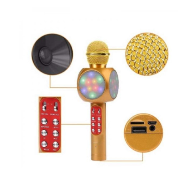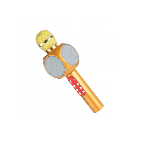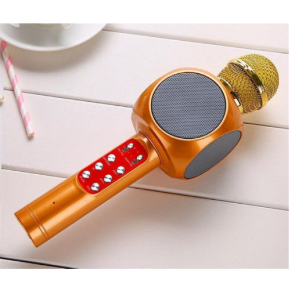 Оригінальний бездротової мікрофон караоке колонка зі світломузикою SQone 1816 Золотий (1816 Gold) - це оригінальне пристрій об'єднало в собі вокальний мікрофон Bluetooth і універсальну стерео колонку. Мобільний караоке-мікрофон SQone 1816 може стати відмінним інструментом для початківців вокалістів або засобом скрасити приємний вечір у компанії друзів. Відмінною особливістю даної моделі є яскрава світлодіодне підсвічування динаміків (при бажанні відключається), яка доповнить атмосферу свята і приверне увагу до співаючого.