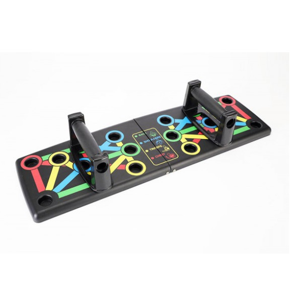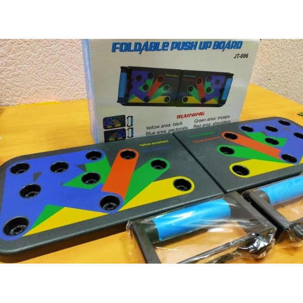 Foldable Push Up Board - це інноваційна система навчання з кольоровими кодами, яка зміцнює і формує весь верх (груди, плечі, спину і руки). Ця потужна підготовча 10-тижнева Програма поєднує в собі віджимання з інтенсивним спалюванням калорій, основними вправами для тренування всього тіла.