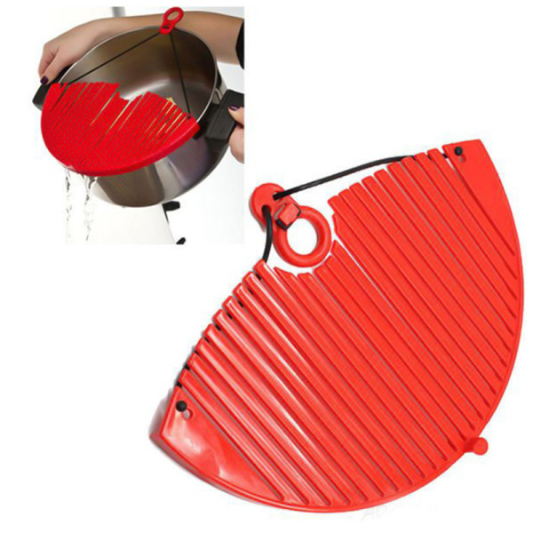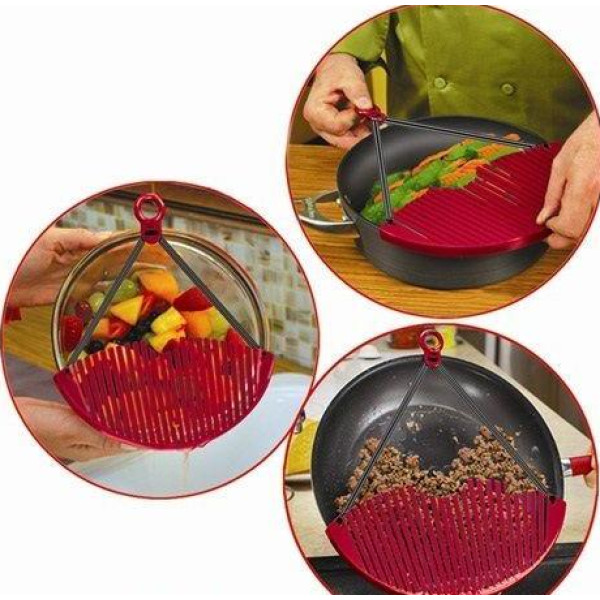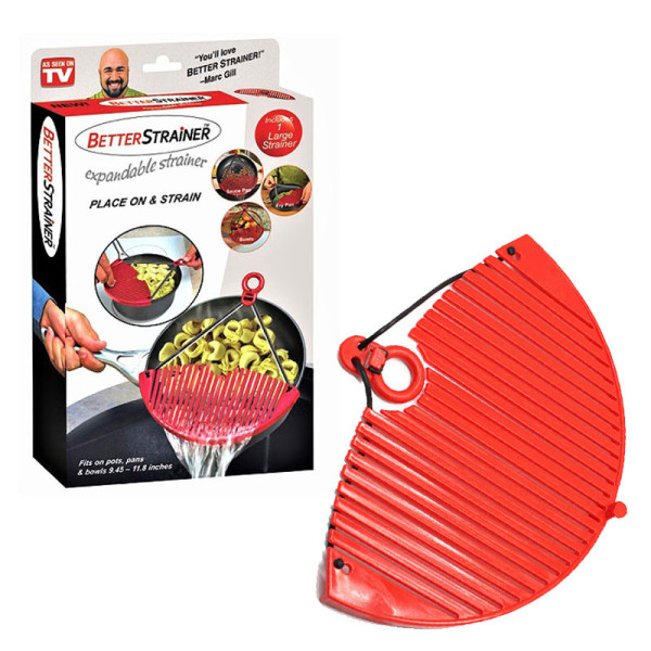 Друшляк-насадка Better Strainer для зливання води Цікаве пристосування для кухні — друшляк накладка для каструлі. Якщо Вам потрібно процідити страву, помити овочі та фрукти, то скористайтеся друшляком-насадкою. Тепер Вам не потрібно пересипати продукти в друшляк, щоб промити або процідити їх. Просто одягніть насадку на каструлю та процідіть. Друшляк займає обмаль місця, легко миється і слугуватиме довго..