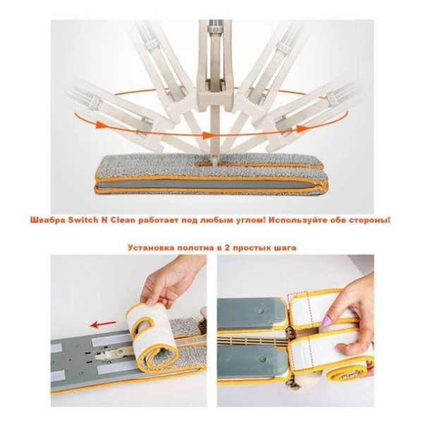 В конструкции предусмотрена специальная насадка с вертикальным отжимом, которая убирает лишнюю воду из микрофибры и удаляет мусор, в том числе хорошо справляется с волосами. На ручке есть механизм (рычаг), который приводит в движение отжим. Платформа поворачивается и проходит через отжимающий блок. Затем возвращается в исходное положение. Пресс имеет дополнительную вставку для лучшего отжима и отличается прочной конструкцией. Уникальная швабра Switch N Clean легко и быстро поможет навести чистоту в помещении, значительно сократив время уборки. Швабра по типу конструкции более модернизированная за счет вращающегося механизма и системы отжима. Приспособление гарантирует чистоту за считанные минуты. Лентяйка отлично справляется с труднодоступными местами, отмывает углы, плинтусы и что важно – бережно относится к любому типу покрытий. Швабра Лентяйка с вертикальным отжимом – оптимальный вариант для людей с чувствительной кожей рук, а также страдающих от болей в спине, контактной аллергии на бытовую химию. Используйте для уборки сначала одну сторону. Затем переверните и используйте вторую. Либо одной стороной мойте, а затем 2-ой вытирайте на сухо.
