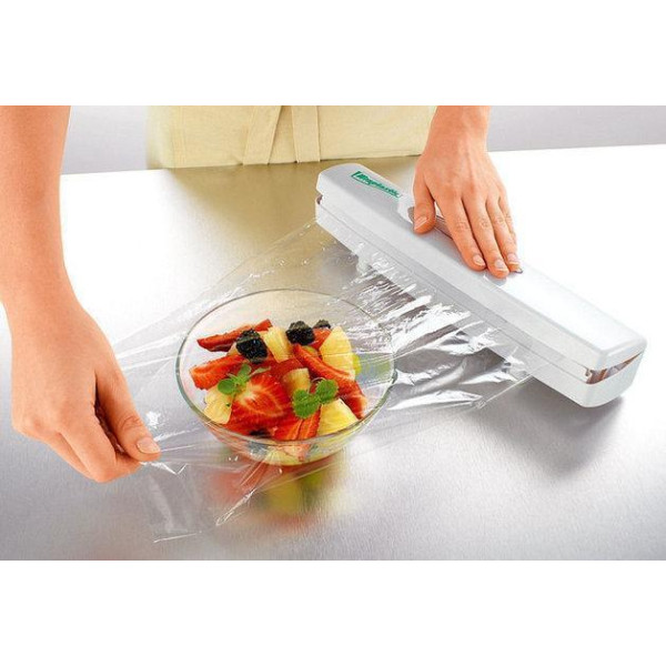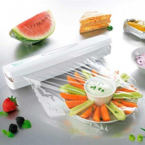 Диспенсер Wraptastic для зберігання та відрізання харчової плівки, фольги, пергаметного паперу призначається для зберігання згорнутої харчової плівки, паперу або фольги, які закріплюються за допомогою спеціальних тримачів, розташованих у ємності пристосування. Пристрій Wraptastic гарантує зручне використання в домашніх умовах, а також у ресторанах. Принцип роботи абсолютно простий. Вам потрібно відміряти необхідну довжину плівки, а потім зробити лише одне натискання на кришечку, яка її рівно розріже.