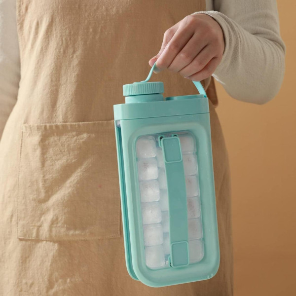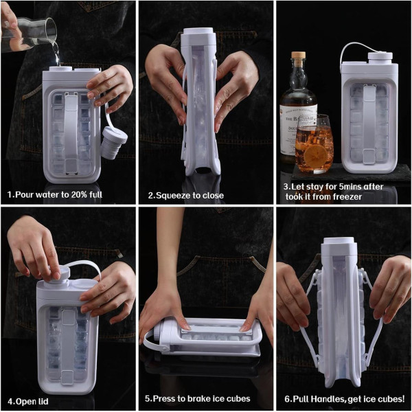 Наша форма для льоду має два стани: вузьке — для заморожування кубиків, і широке — для зручного витягання льоду. В обох станах форма герметична. Переносний льодогенератор забезпечений кришкою, що щільно загвинчується, завдяки чому ви можете охолоджувати напої прямо в ньому, як у фляжці. У широкому стані форма вміщає до трьох склянок охолодженого напою.