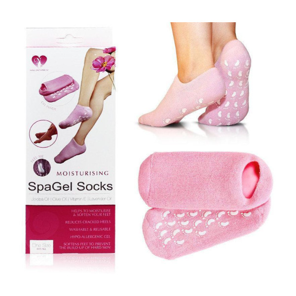 Зволожуючі гелеві шкарпетки SPA Gel Socks – служать для пом'якшення шкіри, запобігання появ інших неприємних речей, тріщин і натоптишів на стопах ніг в домашніх умовах, вони не мають аналогів на українському ринку. Вони являють собою тканеві шкарпетки універсального розміру 35-41 мають унікальну термопластичную гелеву просочення з вітаміном Е, і натуральних ефірних масел лаванди, оливи і жожоба. Ці масла володіють унікальними поживними і зволожуючими властивостями, легко проникають в суху, огрубілу шкіру, роблячи її м'якою та еластичною. Надіті на ноги зволожуючі гелеві шкарпетки SPA Gel Socks створюють комфортне і приємне відчуття тепла. Їх надягають на всю ніч, період використання до п'ятдесяти днів, вони легко стираються в теплій мильній воді до сорока разів, можна дбайливо віджати, уникати сонячного впливу, сушити горизонтально.