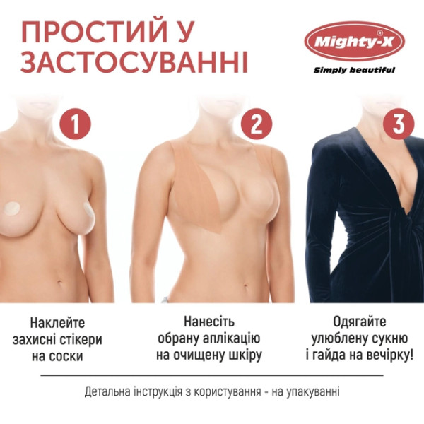 Задумали одягнути на вечірку спокусливу сукню з глибоким декольте, проте відповідний бюстгальтер для неї підібрати не вдається? Mighty-X пропонує найкращий спосіб забезпечити бездоганний вигляд вашого бюсту навіть у найвідвертіші сукні! Високоякісний ліфтинг-тейп для грудей дозволить з допомогою великого вибору аплікацій підняти груди без використання бюстгальтера та зафіксувати у бажаній формі. Висока адгезія тейпа забезпечить невидиму, проте надійну підтримку, незважаючи навіть на найрухливіші танці до сьомого поту впродовж цілої ночі :) М'який та дихаючий бавовняний матеріал забезпечить неперевершений комфорт при використанні, тому Ви можете навіть забути про нього до моменту видалення. Розмочити тейп під час прийому гарячого душу або просочити його дитячою олійкою для легкого відставання від шкіри. Ліфтинг-тейпи Mighty-X дозволять Вам почувати себе королевою вечірки без зайвих зусиль!