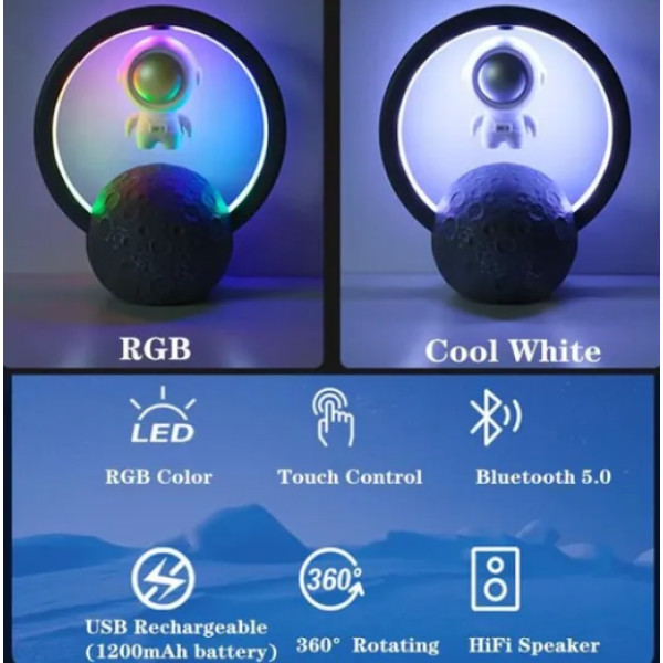 Ця атмосферна лампа на магнітній левітації — не просто джерело світла, а багатофункціональний ґаджет, який об'єднує в собі сучасний дизайн, високоякісний звук і атмосферне освітлення. астронавт, що плаває в повітрі, стане унікальним елементом декору, притягаючи погляди та створюючи затишну атмосферу в будь-якому просторі — чи то спальня, чи то вітальня, чи то офіс.