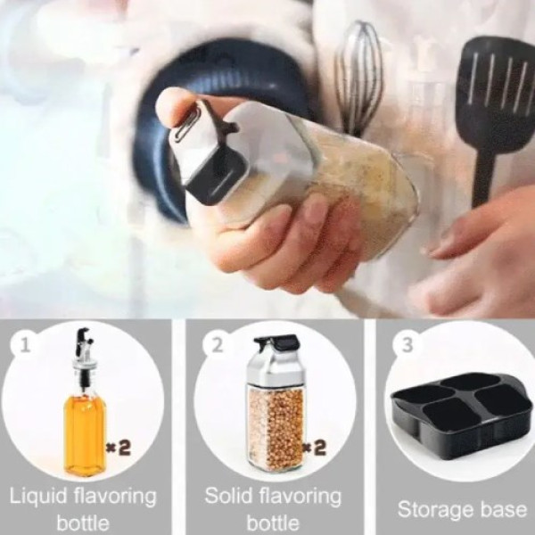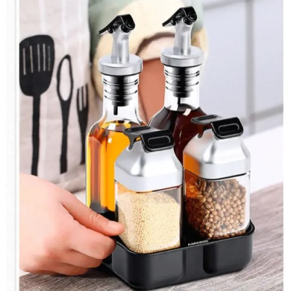 Набір банок для спецій і приправ допоможе навести лад на кухні та стане незамінним у повсякденному житті. Набір складається з підставки, 2 пляшечок для соусів по 175 мл і 2 баночок по 100 мл.