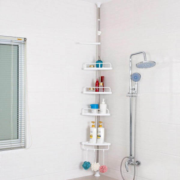 Кутова телескопічна полиця для ванної MULTI CORNER SHELF — являє собою конструкцію з металевої штанги і чотирьох пластикових полиць розміром 24х24х32. До комплекту входять аксесуари для кріплення. Для того, щоб гель для душу або шампунь завжди були під рукою, коли ви приймаєте душ, досить встановити невелику поличку у ванній. Найкраще, якщо ця поличка кутова: так можна заощадити простір, зайнявши «робом» один із кутів. Гелі для душу, шампуні, мило, піни для ванни та всі інші такі необхідні пляшечки та ємності — все це легко вміститься на полиці.