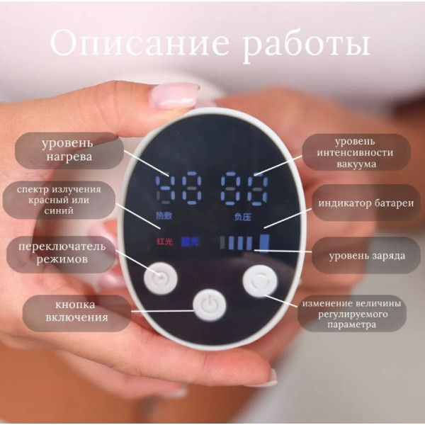 • Працює за принципом вакуумного всмоктування, стимулюючи мікроциркуляцію крові.