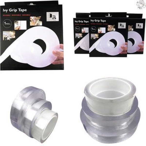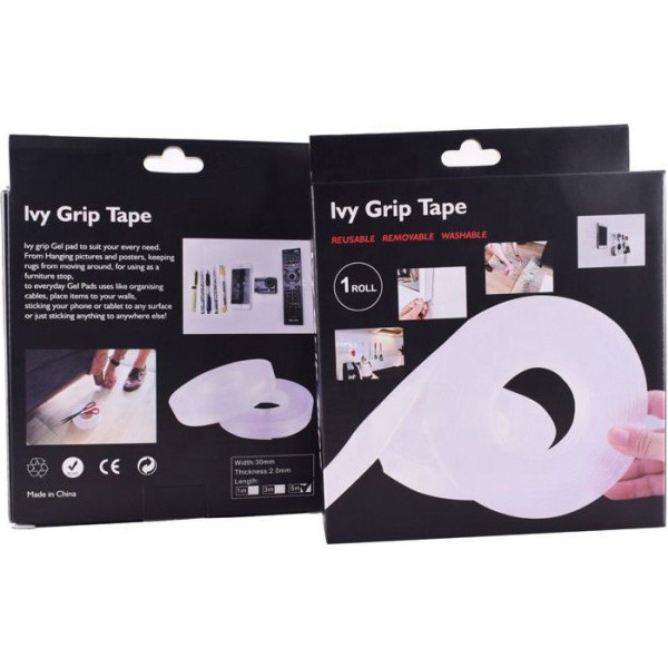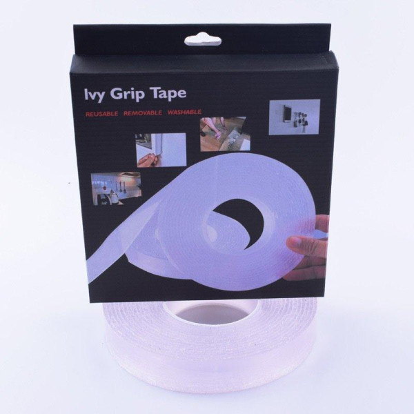 Дуже часто для закріплення тих чи інших предметів ми використовуємо двосторонній скотч. Даний скотч є багаторазовим! Технологія виготовлення Ivy Grip Tape дозволяє приклеювати та відклеювати стрічку безліч разів надійно і якісно, не залишаючи ніяких слідів на поверхні! Після використання клейкої стрічки її треба промити водою і вона знову набуде клейкі властивості.