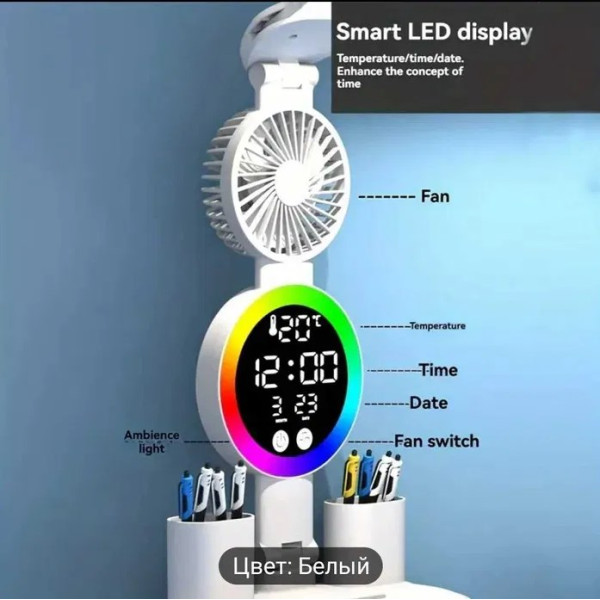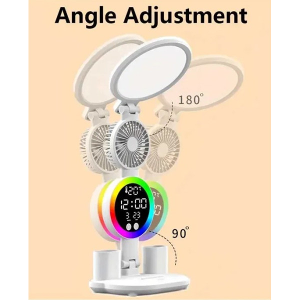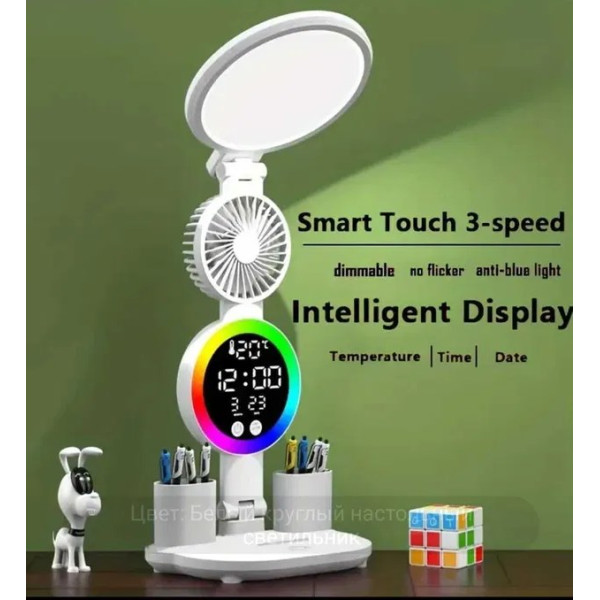 Сучасна настільна лампа – це універсальний аксесуар, який поєднує ефективне освітлення, кольорове RGB-підсвічування, годинник і вбудований вентилятор. Вона стане ідеальним вибором для робочого місця, навчання, читання та створення особливої атмосфери в кімнаті.