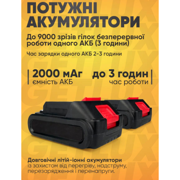 Цей секатор оснащений двигуном потужністю 1000 Вт та працює на акумуляторах з напругою 48 вольт. Ємність кожного акумулятора становить 2000 мА*год, що забезпечує тривалу роботу без підзарядки. Повна зарядка займає лише 2 години, тож ви завжди будете готові до справ.