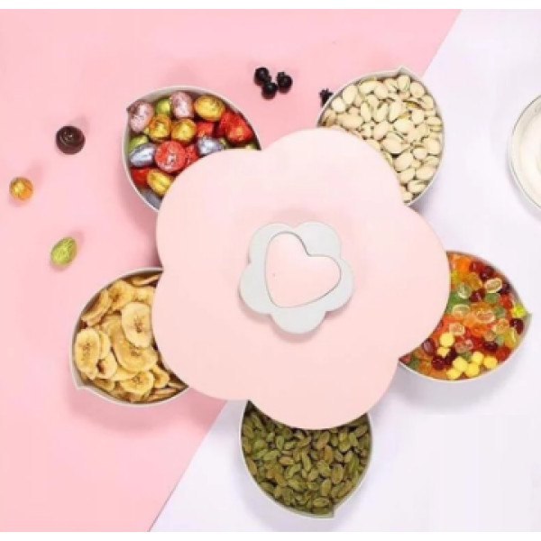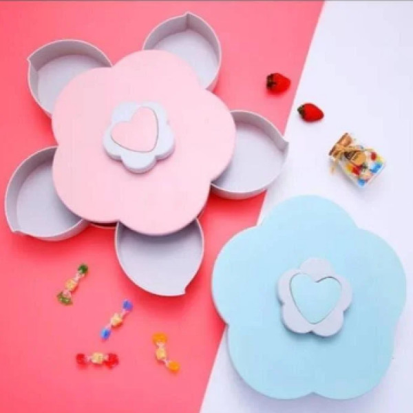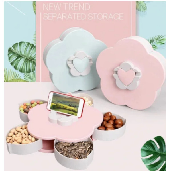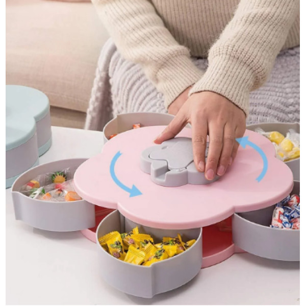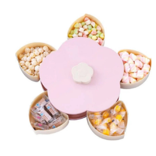 Піднос для солодощів Candy Box впишеться і на святковому столі на будь-якій дорослій вечірці або дитячому святі. Зберігається коробка компактно: завдяки вбудованому механізму 5 відсіків ховаються всередину корпусу. Достатньо лише акуратно повернути поворотний перемикач квіткового типу на верхній частині тарілки, щоб відкрити / закрити чашу для фруктів у формі пелюстки.