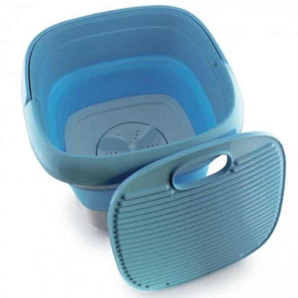 Це складна пральна машина, яка завдяки системі складання у вигляді гармошки, стискається до настільки компактних розмірів, що може поміститися у дорожній валізі.