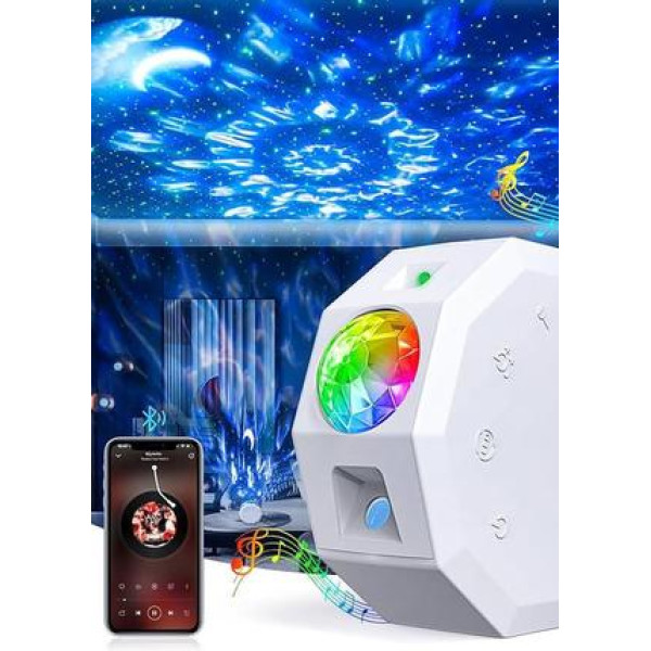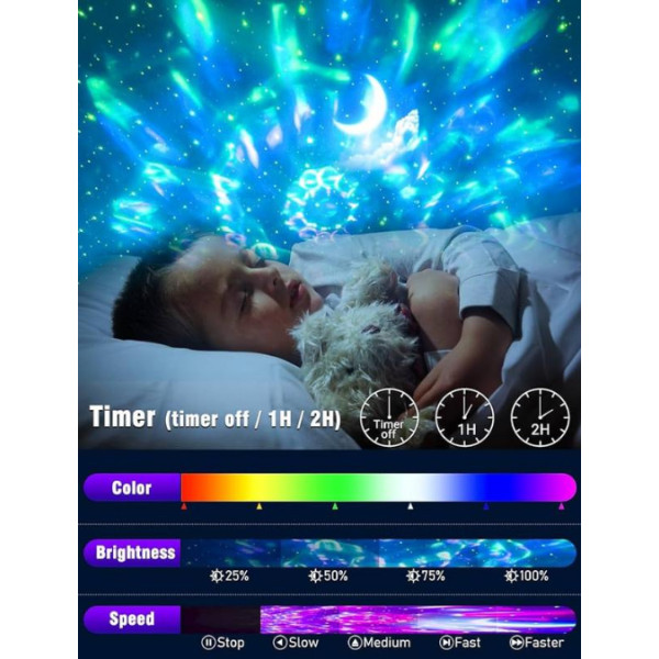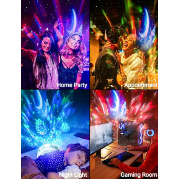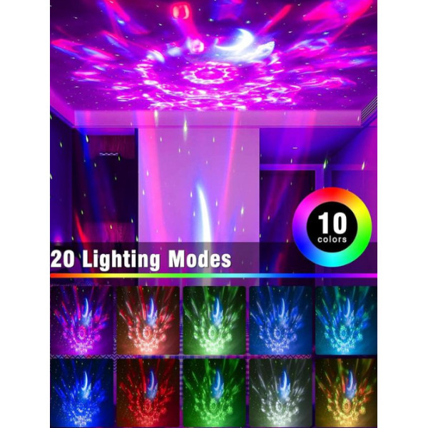 • Комбінація водного рябі та зоряного неба: Ефект водної ряби в поєднанні з проєкцією зірок створює динамічну та розслаблювальну атмосферу. М'які хвилі світла, що плавно переходять у зоряне небо, занурюють вас у казковий світ, де ви можете забути про повсякденні турботи та просто насолоджуватися моментом.