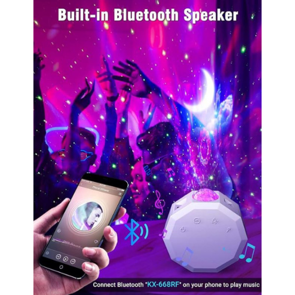 • Вбудований Bluetooth: Проєктор обладнаний Bluetooth-модулем, який дає змогу під'єднувати ваш мобільний пристрій для відтворення музики. Просто під'єднайте свій телефон, і ви зможете насолоджуватися улюбленими треками, створюючи ідеальне поєднання музики та візуальних ефектів. Це робить проєктор не тільки світловим, але й музичним супроводом для ваших вечорів.