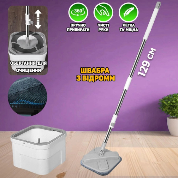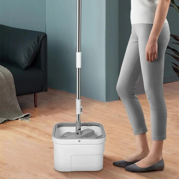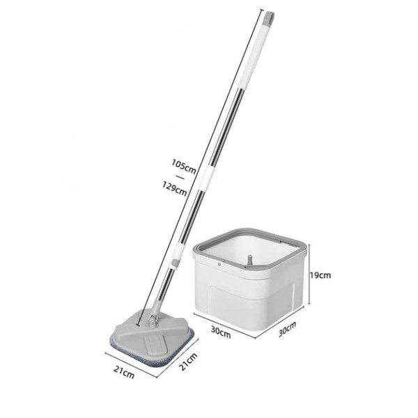 Головка швабри має квадратну конструкцію, без сліпих зон під час прибирання. Квадратні відра легше розмістити в кутку для зберігання, вони також стійкіші до перекидання. Регульована ручка швабри виготовлена з неіржавкої сталі, обладнана шарніром, який обертається на 360 градусів і дає змогу добре очищати шви та щілини, легко видаляючи пил і плями з кожного куточка.