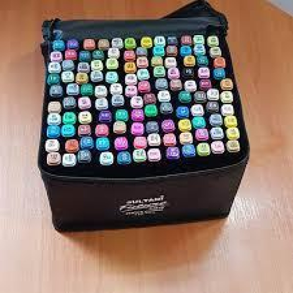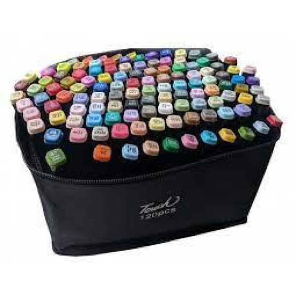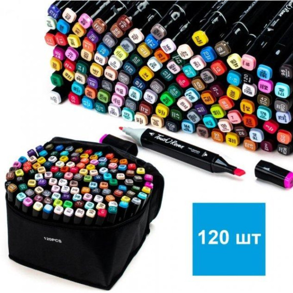 Маркери для малювання та скетчів у чорному тканинному футлярі. Двосторонні, на спиртовій основі. У наборі 120 шт. Основна палітра, оптимально підібрана для малювання всіх стилів.