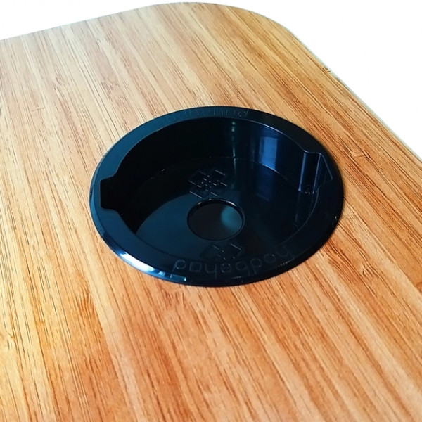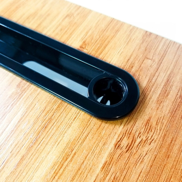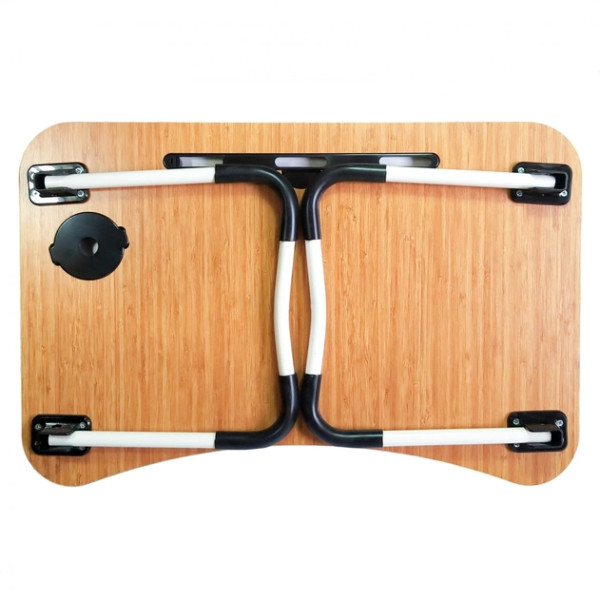 У столі є складні металеві ніжки з прогумованою основою, що протиковзає. Дизайн столу доповнено отвором для планшета, телефону, ручки, склянки та техніки з вузьким екраном.