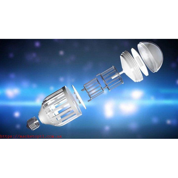 Дві функції в одному приладі. У верхній частині лампи розташований електричний знищувач з УФ-випромінювачем (площа захисту 60 кв. м), а в нижній — кілька потужних світлодіодів, які відмінно світять у вечірній час;