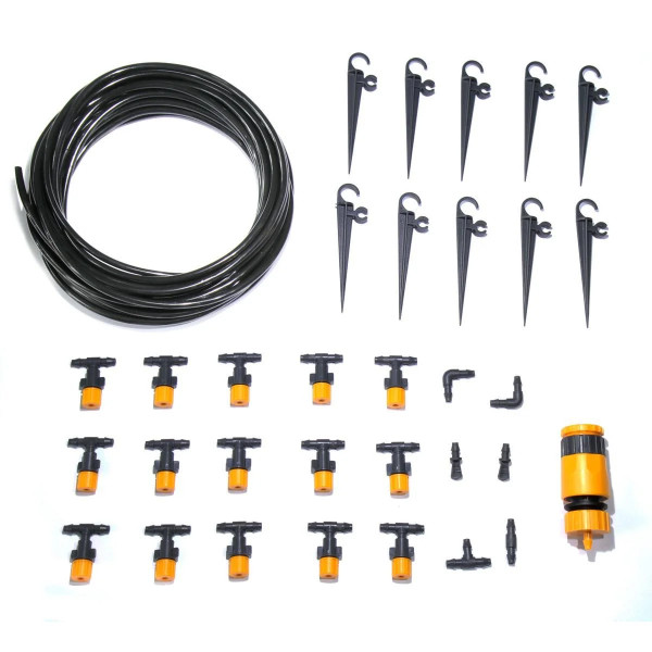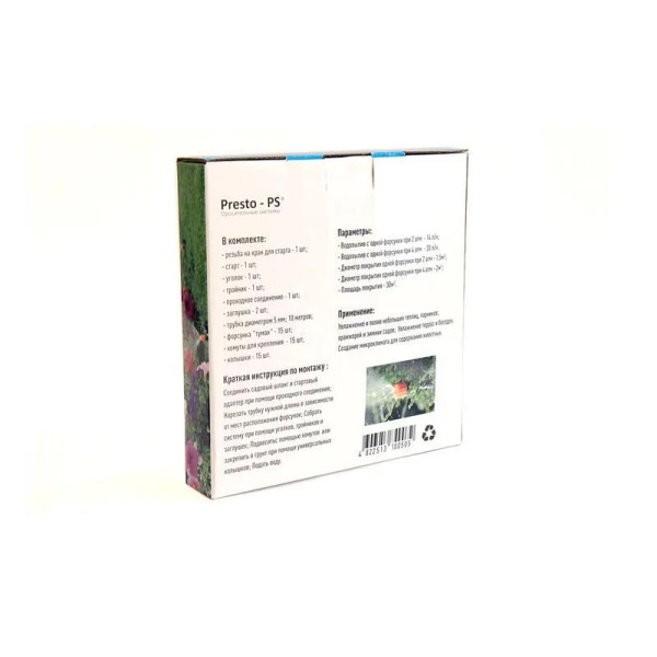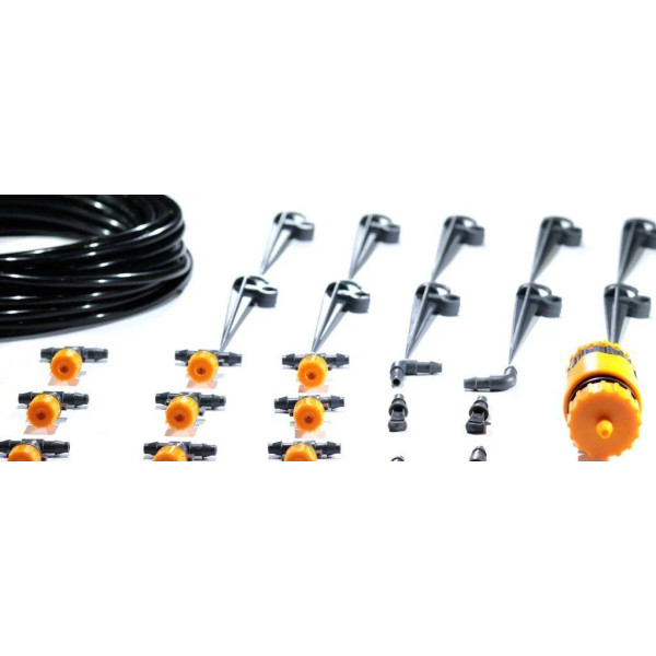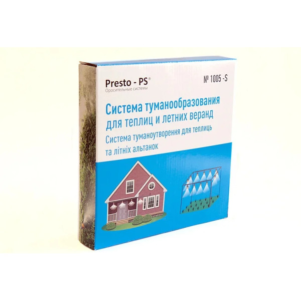 Набір Presto-PS система туманоутворення (1005-S) дозволяє швидко створити систему крапельного поливу та зволоження повітря завдяки простій і продуманій конструкції. Продуктивність системи 200 літрів у годину, кількість крапельниць в наборі - 15 штук, шланг діаметром 5 мм довжиною 10 метрів. Діаметр захоплення однієї форсунки до 2 метрів. Набір застосовується для побудови системи туманоутворення. Використовується для зволоження повітря террасках і в альтанках. для поливу та зволоження повітря в парниках і оранжереях. Так само застосовується для домашніх квітників, зимових садів і в ландшафтному дизайні. Для зволоження повітря використовується підвісний метод монтажу, а для поливу рослин установка в грунт. Робочий тиск 1-3 атмосфери. Виготовлений з високоякісного, стійкого до впливу сонячного випромінювання і хімікатів ПВХ. При виробництві використовуються якісні первинні матеріали.