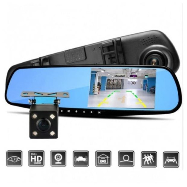 Камера заднього виду з 4 світлодіодами підсвічування може використовуватися як парктронік. Запис ведеться відразу на дві камери. При включенні задньої швидкості відеореєстратор автоматично перемикається на камеру заднього виду. Має датчик руху і датчик удару G-sensor.