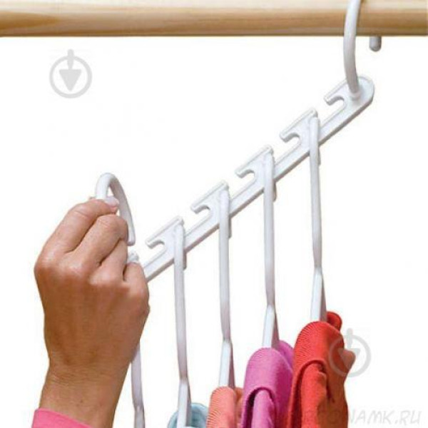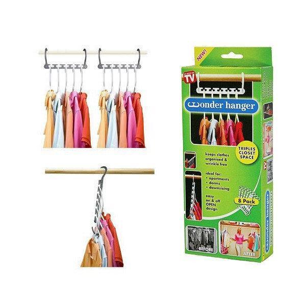 Ви зможете повісити 40 речей на цей унікальний набір! Wonder Hanger — це дуже зручна складана вішалка, що дає змогу заощадити масу вільного місця. Універсальну вішалку можна розташувати в платтяній шафі двома способами: у горизонтальному положенні на двох гачках і у вертикальному на одному гачку. Перекладини можна рухати, легко знімаючи необхідну річ. Такий вішак дає змогу розмістити п'ять пар штанів, кілька топів або інших предметів гардероба одночасно. Речі надійно утримуються затискачами, спідниці вішаються на спеціальні петлі. Універсальний вішак вимагає мінімум місця в шафі та під час транспортування.