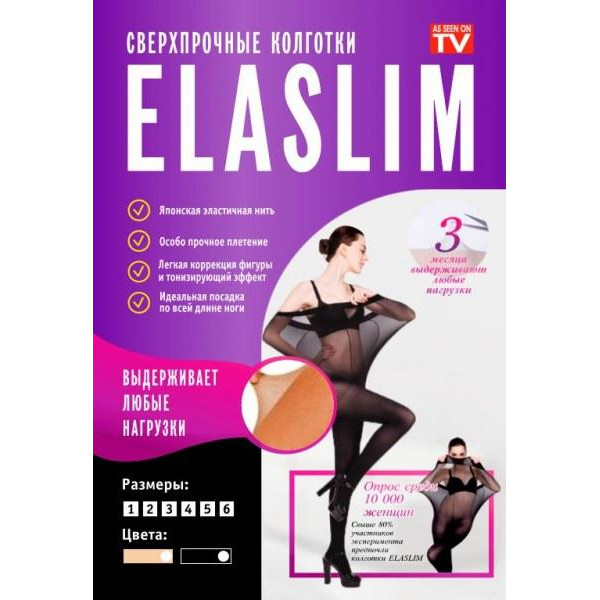 Колготки ЭлаСлим створені за типом компресійного білизни, яке не порушує, а навпаки, покращує кровотік, будучи профілактикою варикозного розширення вен на ногах у жінок.