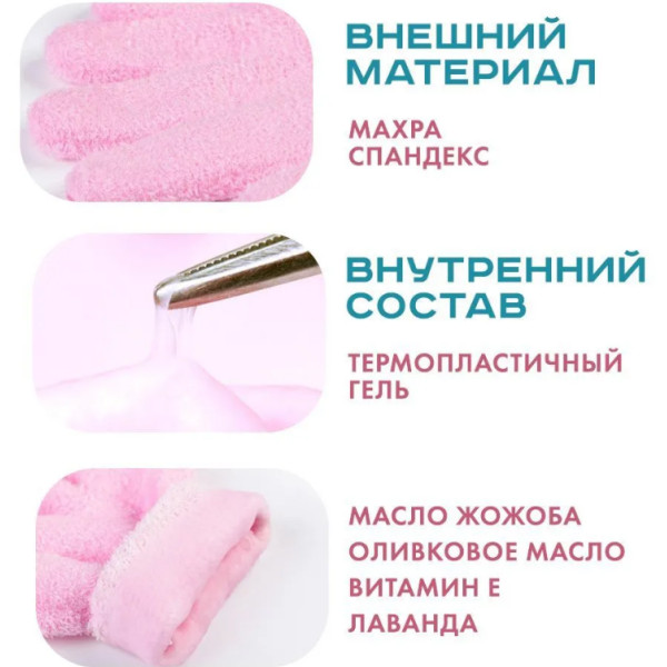 Щоб шкіра ваших рук залишалася ніжною, здоровою та зволоженою надовго, досить носити косметичні рукавички лише 20 хвилин на день. Ці унікальні рукавички надають потужний доглядовий ефект завдяки термопластичному гелю, який містить вітамін Е та натуральні ефірні олії жожоба, оливи та лаванди. Ці інгредієнти відомі своїми глибокими зволожувальними та поживними властивостями, забезпечуючи швидке проникнення в суху та грубу шкіру. Унаслідок цього шкіра стає м'якшою, еластичнішою та має доглянутий вигляд.
